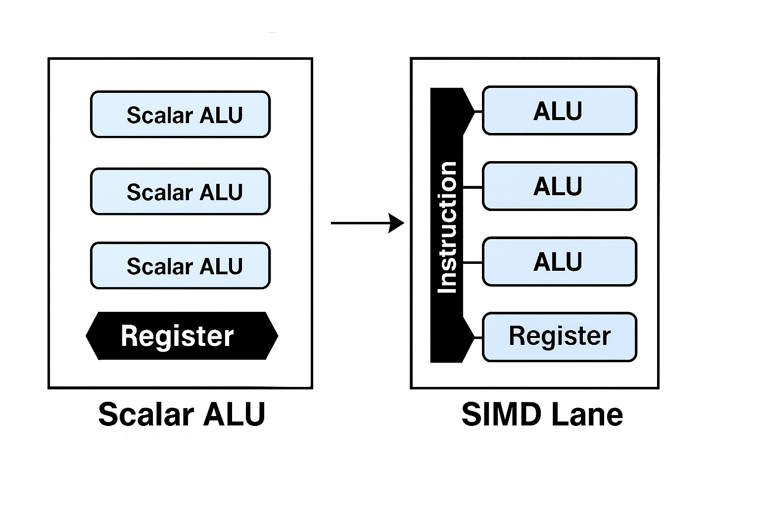 하나의 명령어(Single Instruction)를 Scalar ALU의 묶음인 SIMD Lane에 전달하여 연산에 사용될 Multi-Data를 레지스터/버퍼(L1/L2, GPR)에 담아 연산하도록 실행