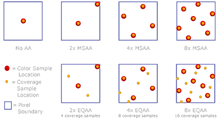 하지만 VRAM 용량이 어느정도 여유가 생기자, 픽셀 내부의 Color Sample과 Coverage Sample을 저장할 수 있는 구조가 가능해졌고, MSAA는 Pixel Shader는 한 번만 수행하고, Coverage Test와 Color Resolve만 샘플 수에 따라 반복하는 방식으로 SSAA 대비 큰 폭의 최적화를 달성했습니다.